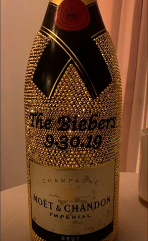 Por otro lado, se han filtrado algunas fotografías en las redes sociales en las que se puede medio detallar algunas de las piezas que usaron los novios. Una de las personas que difundió imágenes fue Justine Skye, quien compartió fotos de la novia con una chaqueta de cuero color negra sobre su vestido blanco, en el que se puede leer «esposa». Además, también ha colgado una imagen de una botella de champán Moet&Chandon cubierta de cristales en la que se puede leer el nombre de los novios y la fecha del enlace: 30 de septiembre de 2019.