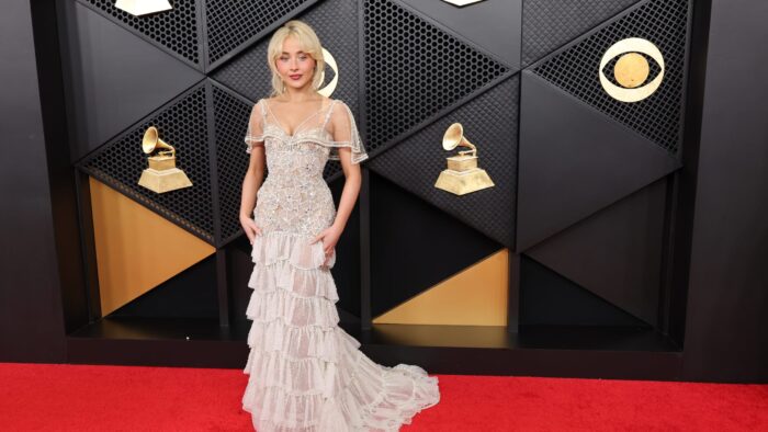 La cantante de «Espresso» deslumbró con un romántico vestido de Valentino. Su interpretación de «Manchild» fue una de las más aplaudidas por su estética cinematográfica.