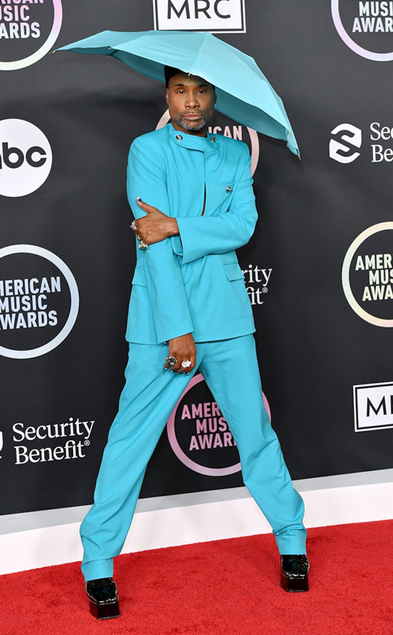 En el calzado decidió portar zapatos azules para dejarle el protagonismo al traje tan llamativo. El contraste del vestuario con su piel hizo a Billy el centro de las miradas.
