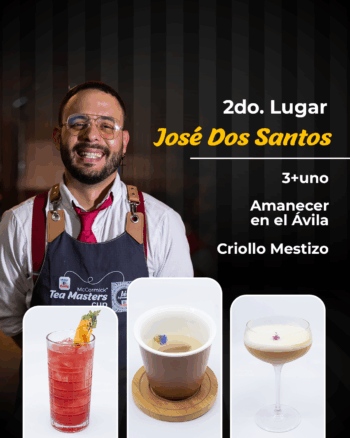 El segundo lugar fue para José Dos Santos, con sus bebidas: “Criollo Mestizo”, un tea cocktail inspirado en el mestizaje y las sinergias de las razas que nos hacen ver distintos; su té caliente “Amanecer en el Ávila”, una alternativa para quienes no toman café y necesitan una bebida cálida para activarse para iniciar el día, y su Mocktail “3+unos” inspirado en el momento en que Caracas se tiñe de rojizo y los cuerpos se reactivan.