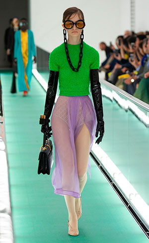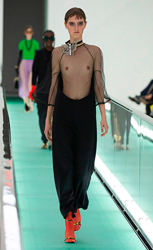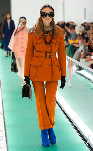 Es así como nace esta propuesta titulada Gucci Orgasmique, que posee los fundamentos del pasado pero la fuerza del futuro: transparencias, lentes súper grandes con cadenas, bolsos de cabezas de animales como cestos, plataformas en colores, y todos los elementos que hacían alusión a los años setenta.