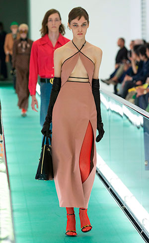 Pues, esta propuesta, que arropa la temporada Primavera-verano que ha presentado en el cierre de la Milan Fashion Week, ha sido toda una declaración de intenciones, debido a que se trata de una colección que, frente al bello horror de sus trabajos anteriores, se presentaba como una evolución natural «limpia y sencilla«. Conservando según los estándares maximalistas de Michele, lo que da cabida a depurados pantalones de pata de elefante, túnicas de corte años setenta, americanas de impoluta sastrería, entre otros elementos.