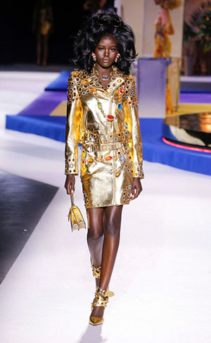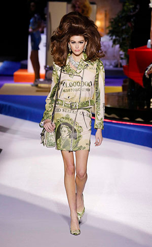 A su vez, se dejaron ver atuendos como abrigos dorados con incrustaciones de piedras preciosas, vestidos de diamantes de imitación de oro adornados con grandes nudos o en un mini vestido palabra de honor que, además, estaban cubiertos con estampados de dólares impresos, así como también en pieles redundantes, en las que se incluyeron una estola interminable de zorro blanco que llegaban hasta los pies.
