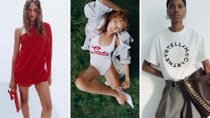 La colección une pasado y presente, combinando piezas muy cotizadas actualmente, como camisas holgadas, gabardinas amplias y sastrería entallada, con icónicos y divertidos éxitos de los archivos de McCartney, incluyendo estampados con pedrería y camisetas con eslóganes.