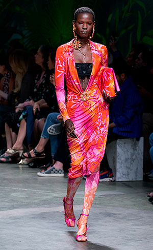 Por otro lado, la propuesta de Versace también estuvo caracterizada por una serie de atuendos de teñido anudado, con camisetas de manga larga y medias de colores pastel y fluorescentes, con chaquetas para la lluvia igualmente brillantes de color neón y vestidos negros adornados con enormes lentejuelas. De igual forma, se exhibieron una serie de conjuntos de seda y brillo que transportaron a los asistentes a una isla exótica imaginaria.