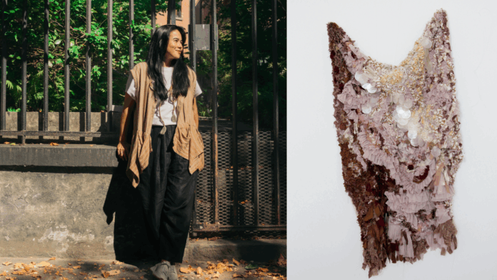 Siguiendo su propio enfoque de moda sostenible, Laili Lau utilizó en esta pieza, retazos de diversas telas, brocados, sedas y conchas de nácar. “Los retazos de tela, cosidos a mano, con efecto de arruche, son fragmentos de trayectos y recuerdos que encuentran un nuevo propósito. Cada textura y cada color evocan raíces, tierra y algo profundamente orgánico. La pieza invita a la cercanía, a la reflexión y al tacto. Es también un estudio de equilibrio, que busca armonía entre lo sutil y lo crudo, respetando la esencia de los materiales tal y como son”.