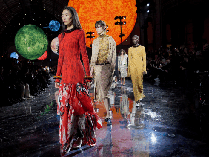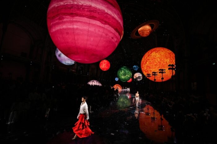 El diseñador introdujo un concepto onírico y cósmico, presentando la colección como un «sueño celestial». La escenografía, con un universo de estrellas y constelaciones, sirvió de telón de fondo para las prendas, conectando el legado de la marca con una perspectiva moderna.